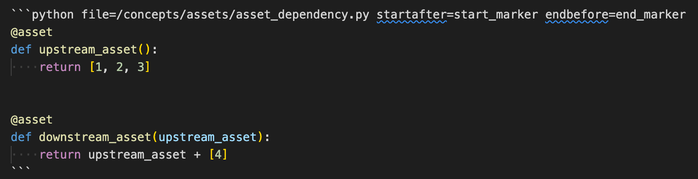 In .mdx files, you'll see a code snippet with python file=/path/to/file.py startafter=start_marker endbefore=end_marker at the beginning of the block. For example: